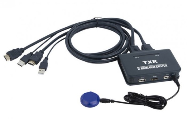 KVM-переключатели – это специальные устройства для коммутации одного комплекта подключаемой к компьютеру периферии между несколькими компьютерами. У них может быть разное обустройство, разные интерфейсы подключения дисплеев, разный функционал, включающий коммутацию разной компьютерной периферии – только клавиатуры и мышки или в добавок к ним монитора и прочих подключаемых устройств. Вот, к примеру, простая бюджетная модель KVM-переключателя, она рассчитана только на два компьютера с HDMI-портами, но предусматривает совместное использование ими клавиатуры, мыши, монитора, а также принтеров и USB-дисков.
